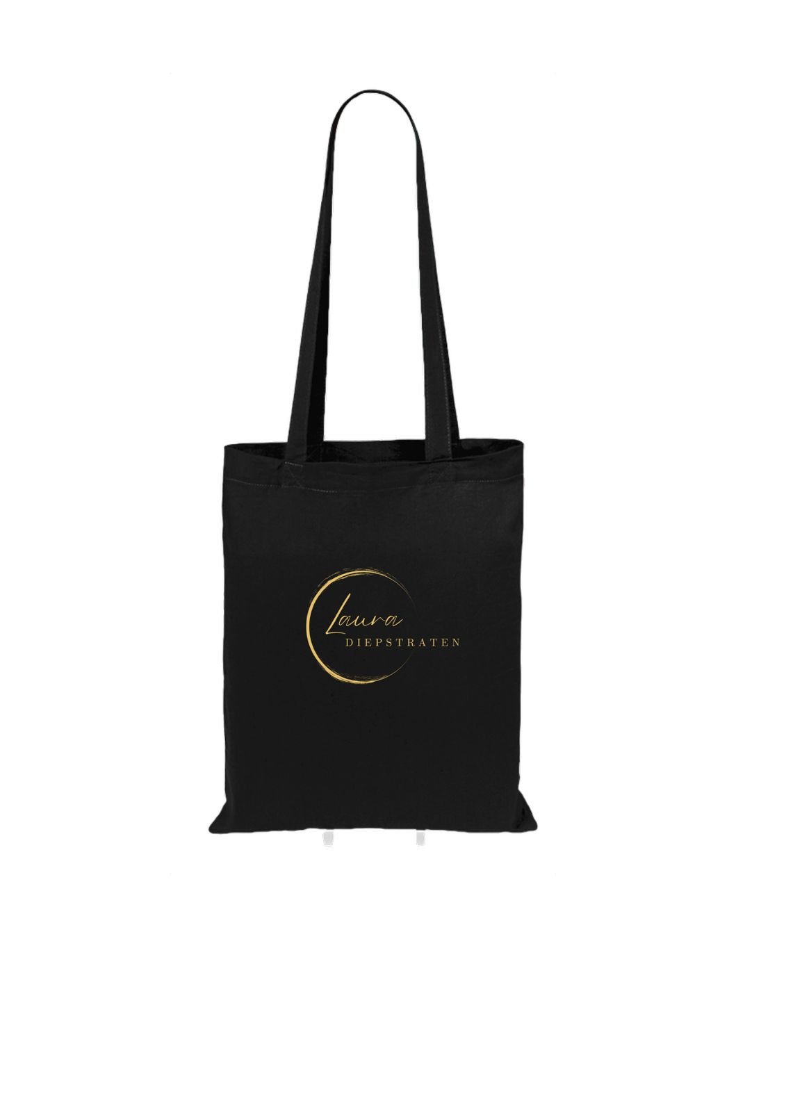 Bolsa negra de algodón con asas largas y logo oficial de Laura Diepstraten. Resistente, ligera y lista para acompañarte a todas partes.
