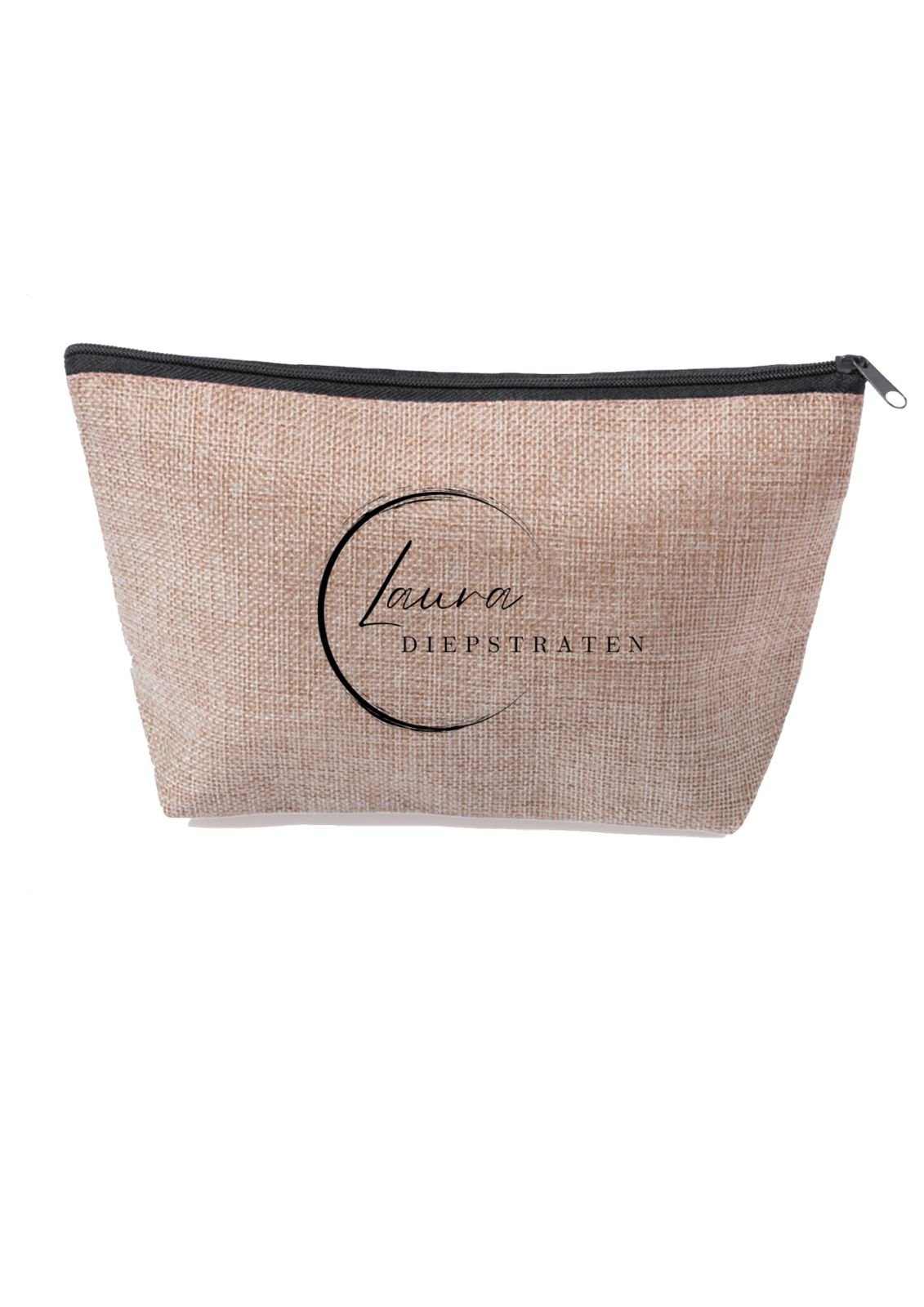 Necesero elegante de tejido natural con cremallera y logo oficial de Laura Diepstraten. Ligero, práctico y perfecto para llevar tus esenciales con estilo.